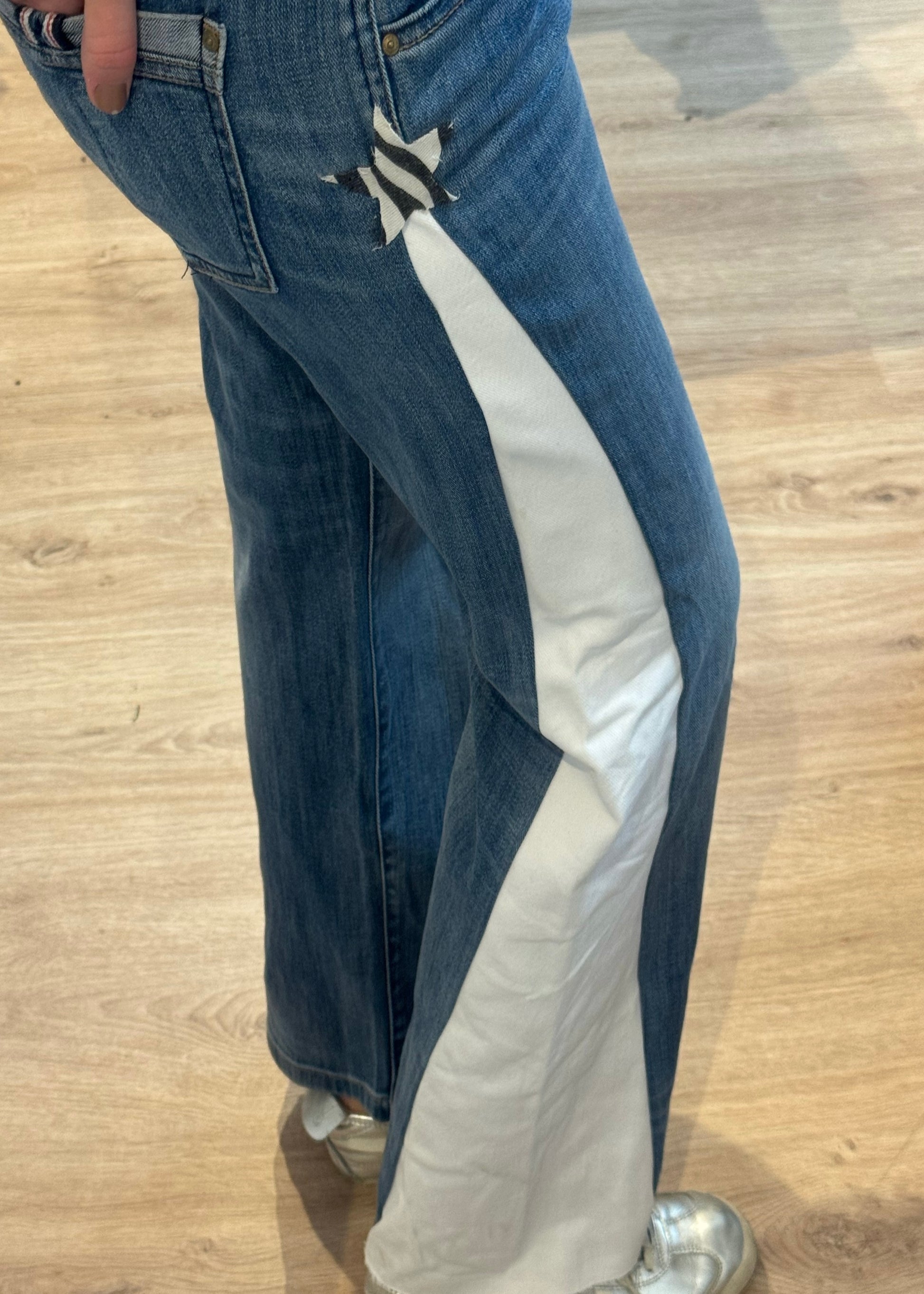 Jeans de denim azul con detalle en tejido blanco y animal print.
